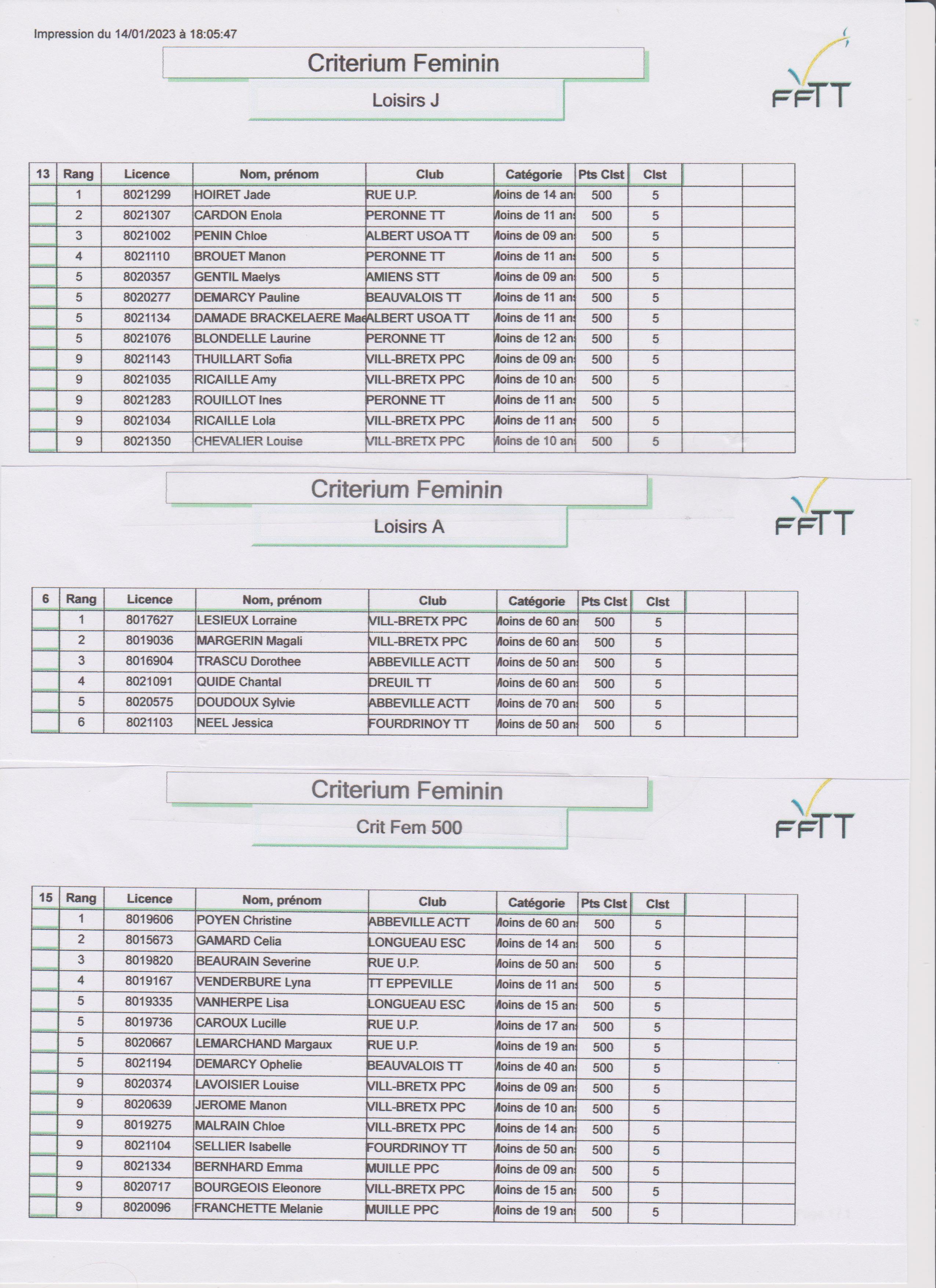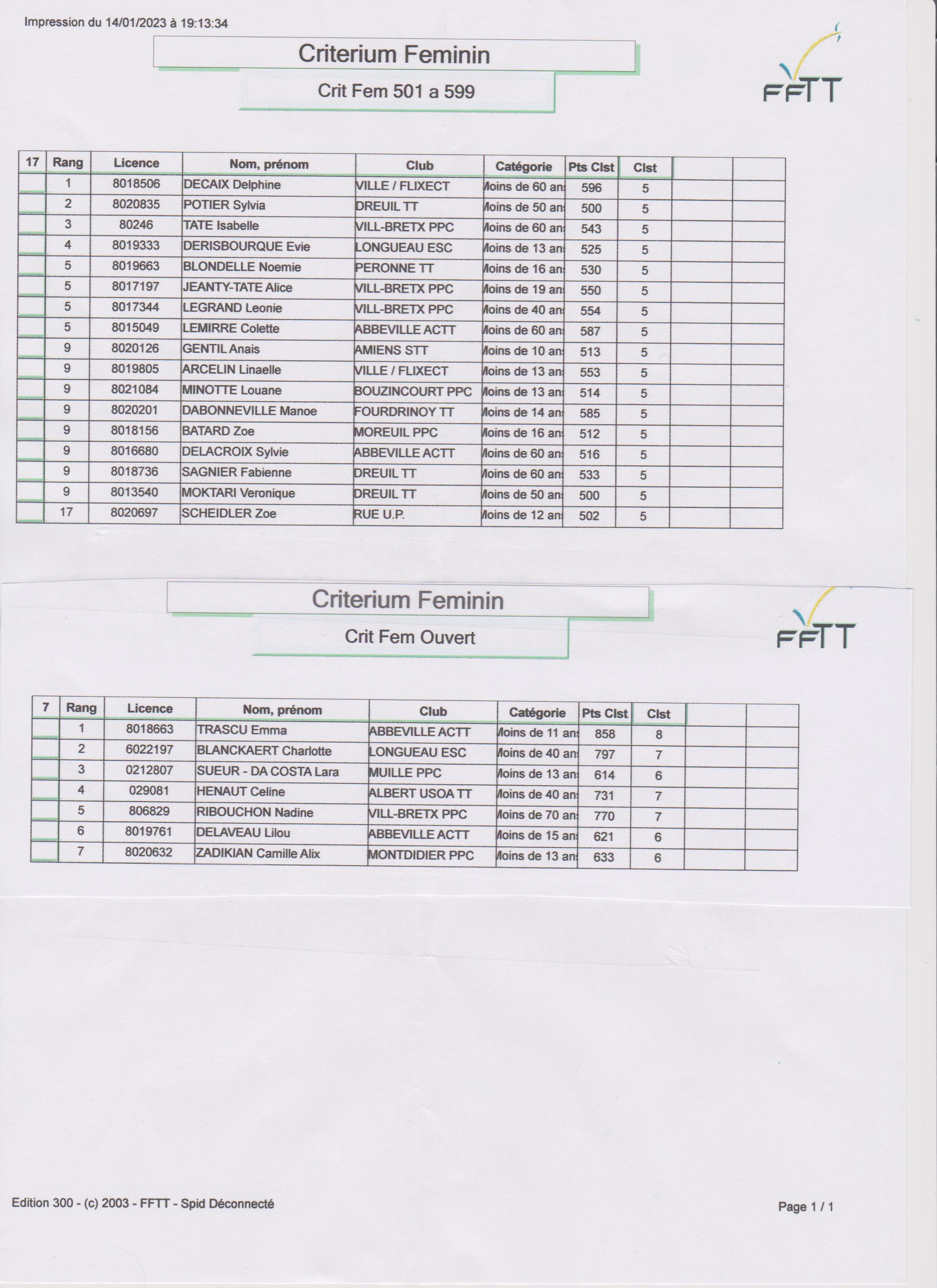 Résultats de l'OPEN Féminin qui s'est déroulé le Samedi 14 Janvier 2023 au COB de Villers-Bretonneux