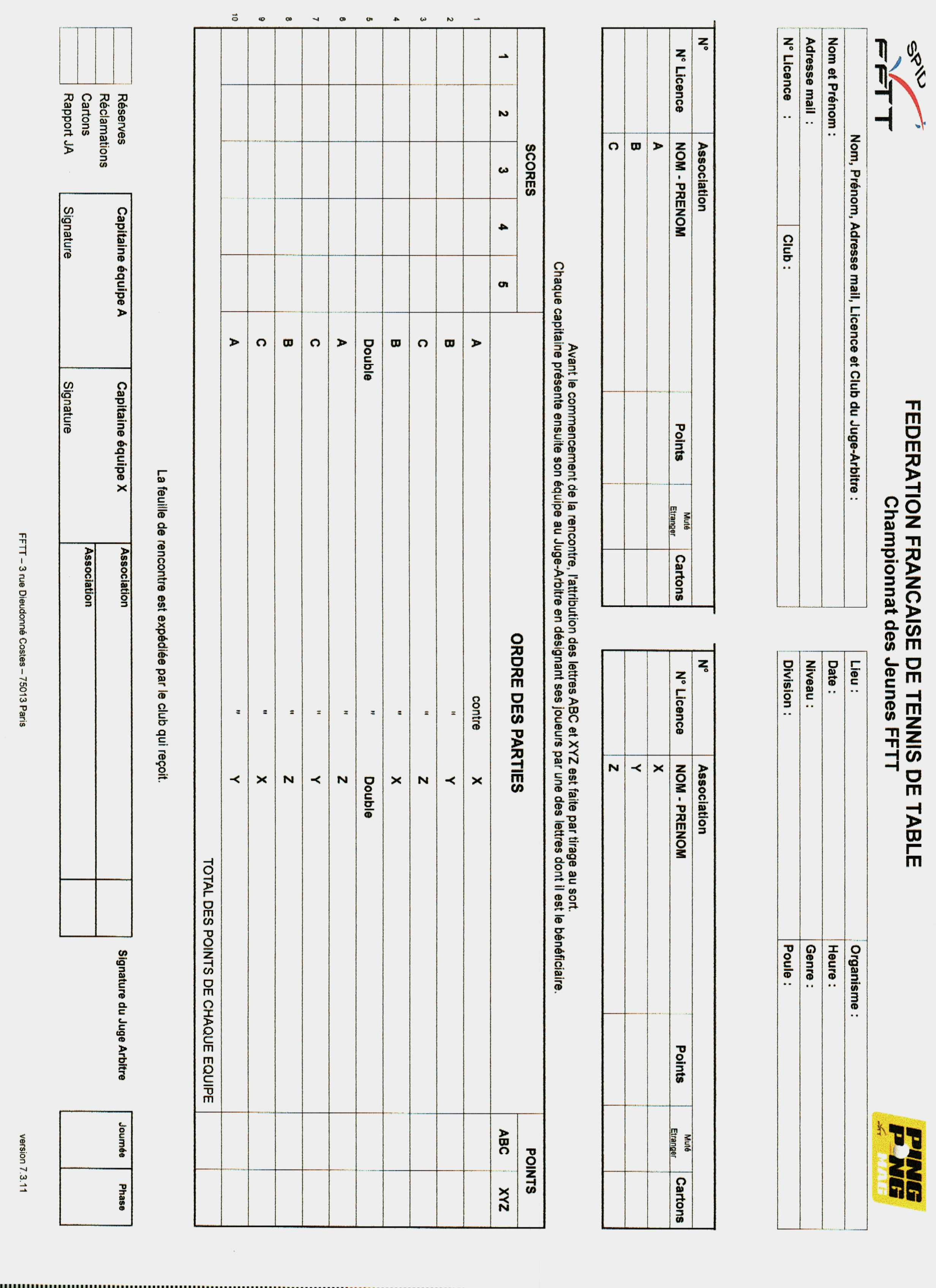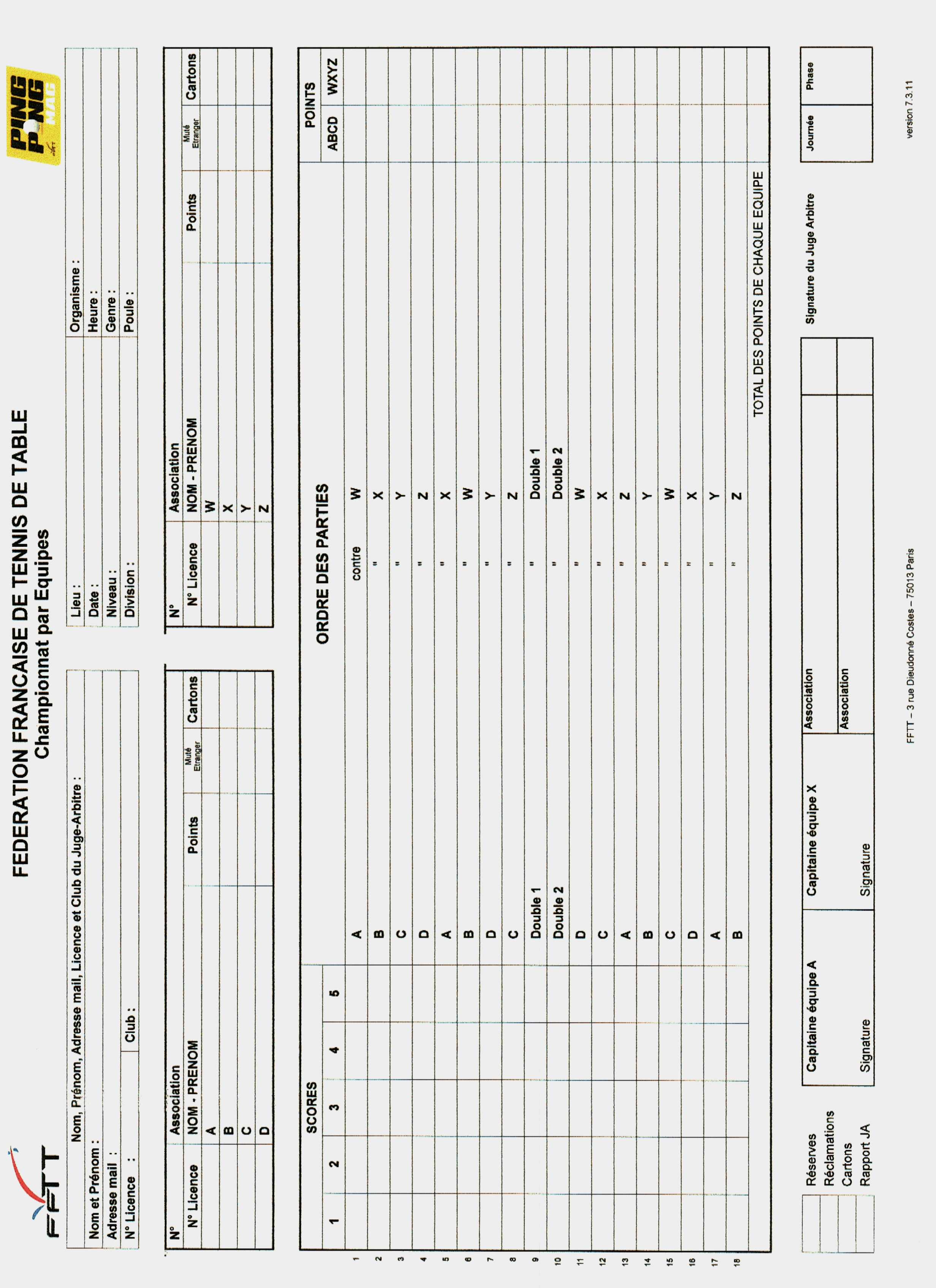Feuille de match vierge pour championnat Adultes par equipes