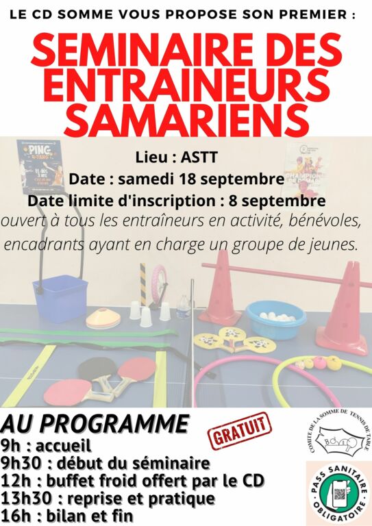 Suite à la réunion de la commission technique, le Comité départemental vous propose ce petit séminaire destiné aux entraineurs Samariens, n'hésitez à vous inscrire, c'est gratuit !