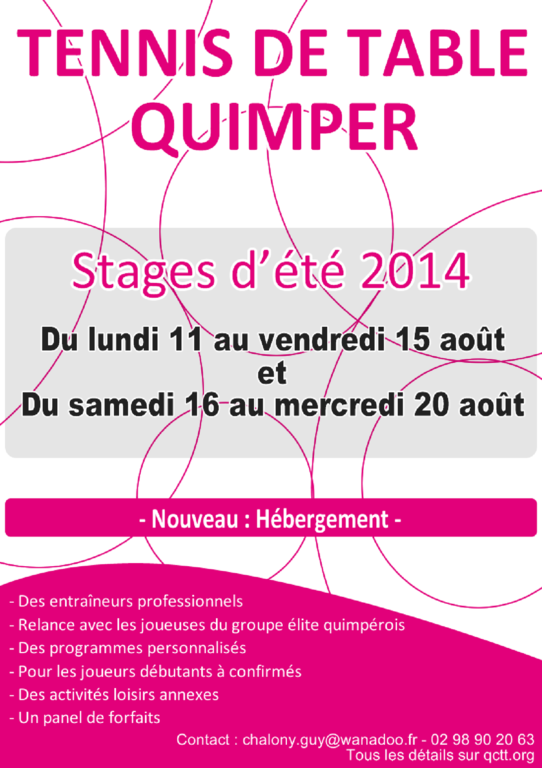 Le Quimper CTT organise 2 stages d'été du 11 au 15 aout et du 16 au 20 aout 2014.